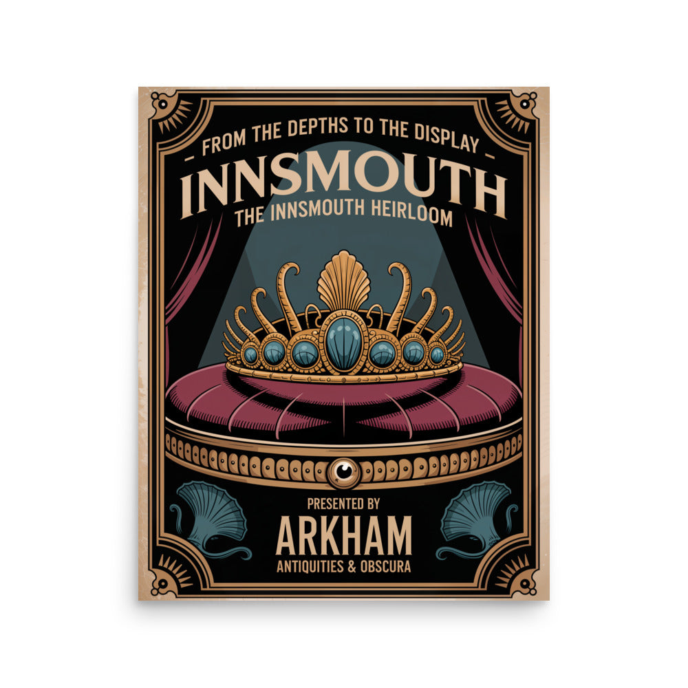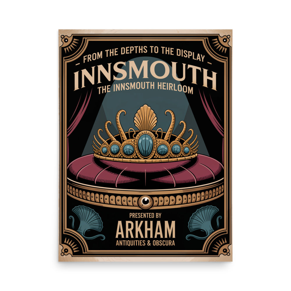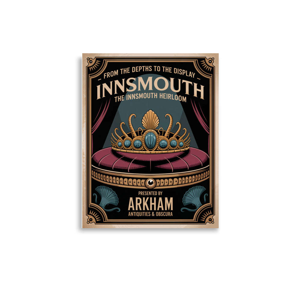 Arkham Antiquities & Obscura präsentiert ein elegantes Art-déco-Ausstellungsplakat für die legendäre Tiara von Innsmouth. Das Poster zeigt eine goldene Tiara mit eingelegten Meerestiermotiven – Tentakeln und Fischaugen – auf einem Samtkissen unter stimmungsvollem blauen Licht. Eine subtile Horrorästhetik und der Vintage-Stil wecken ein Gefühl verbotener Faszination und Lovecraftscher Mysterien. Der Satz „Aus der Tiefe in die Ausstellung – Das Erbstück von Innsmouth“ verstärkt die okkulte Faszination und macht dieses Stück perfekt für Fans von kosmischem Horror und antiken Sammlerstücken.