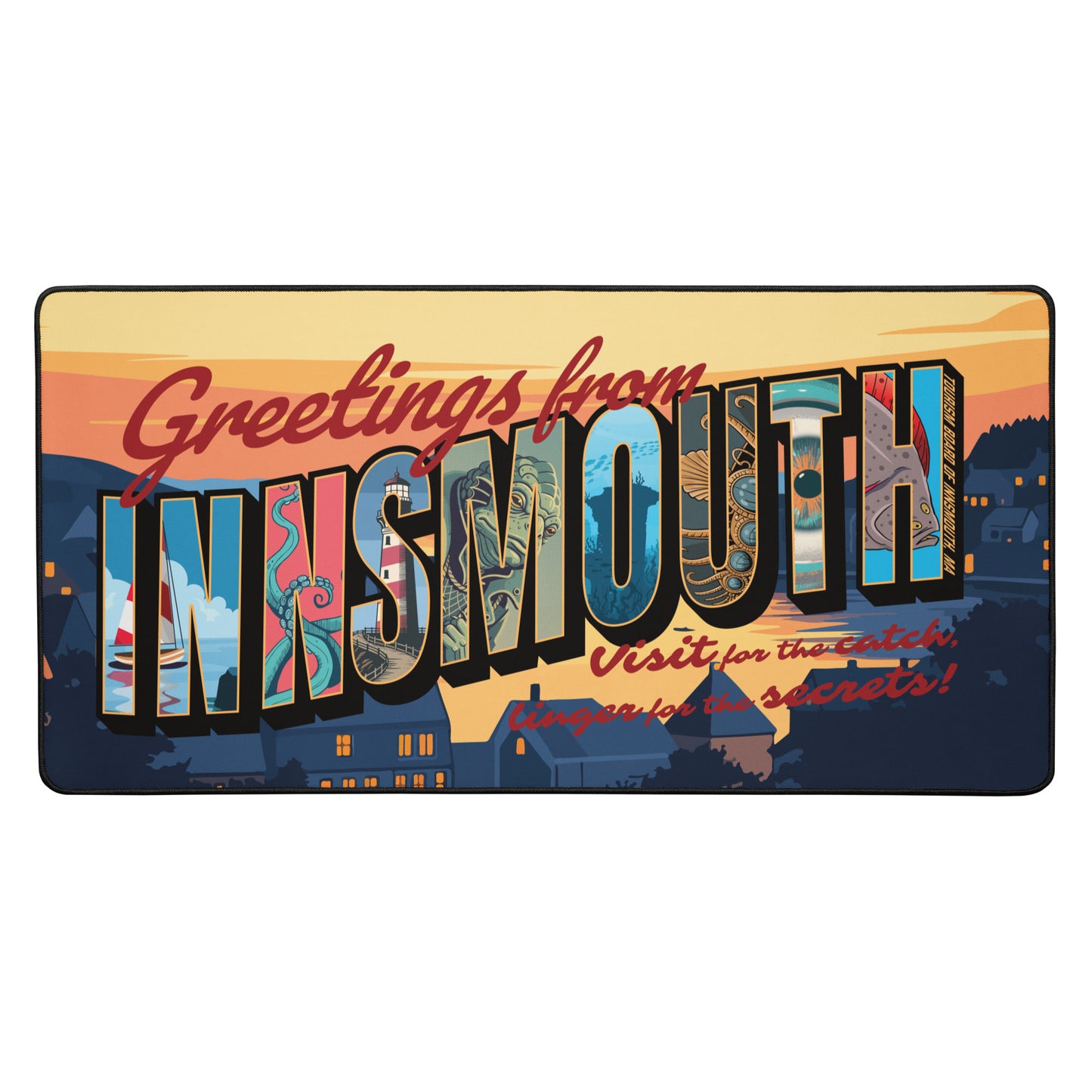 A large‑format "Greetings from Innsmouth" travel‑poster featuring retro letter‑inlay scenes of coastlines, lighthouses and fishing life with subtle, unsettling Lovecraftian motifs. Flat colors, strong silhouettes and halftone textures evoke a nostalgic vintage postcard aesthetic. The design marries classic seaside tourism imagery with an undercurrent of uncanny maritime menace.