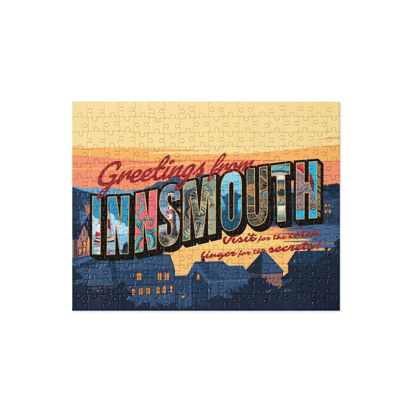 A large‑format "Greetings from Innsmouth" travel‑poster featuring retro letter‑inlay scenes of coastlines, lighthouses and fishing life with subtle, unsettling Lovecraftian motifs. Flat colors, strong silhouettes and halftone textures evoke a nostalgic vintage postcard aesthetic. The design marries classic seaside tourism imagery with an undercurrent of uncanny maritime menace.