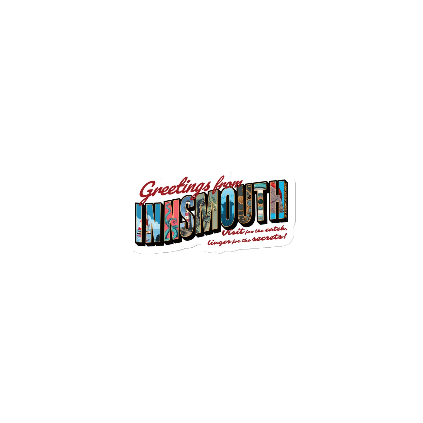 A large‑format "Greetings from Innsmouth" travel‑poster featuring retro letter‑inlay scenes of coastlines, lighthouses and fishing life with subtle, unsettling Lovecraftian motifs. Flat colors, strong silhouettes and halftone textures evoke a nostalgic vintage postcard aesthetic. The design marries classic seaside tourism imagery with an undercurrent of uncanny maritime menace.